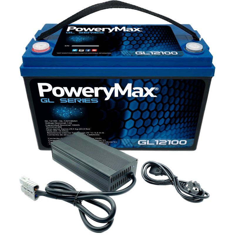 La serie GL12100 es una serie de baterías de gel de alto rendimiento. Diseñadas y fabricadas para alimentar motores eléctricos de 12V, también podrás alimentar todo el sistema eléctrico de tu embarcación, así como tus equipos de Sonda GPS Plotter. PoweryMax GL12100 es una serie de baterías increíbles basadas en GEL de la máxima calidad. PoweryMax ha creado este producto bajo el criterio de máxima eficiencia, facilitándote una mayor capacidad y autonomía. Incluye un cargador inteligente con el que podrás recargar tu batería PoweryMax GL12100. PoweryMax GL12100 es posiblemente la mejor batería de gel en su especie.