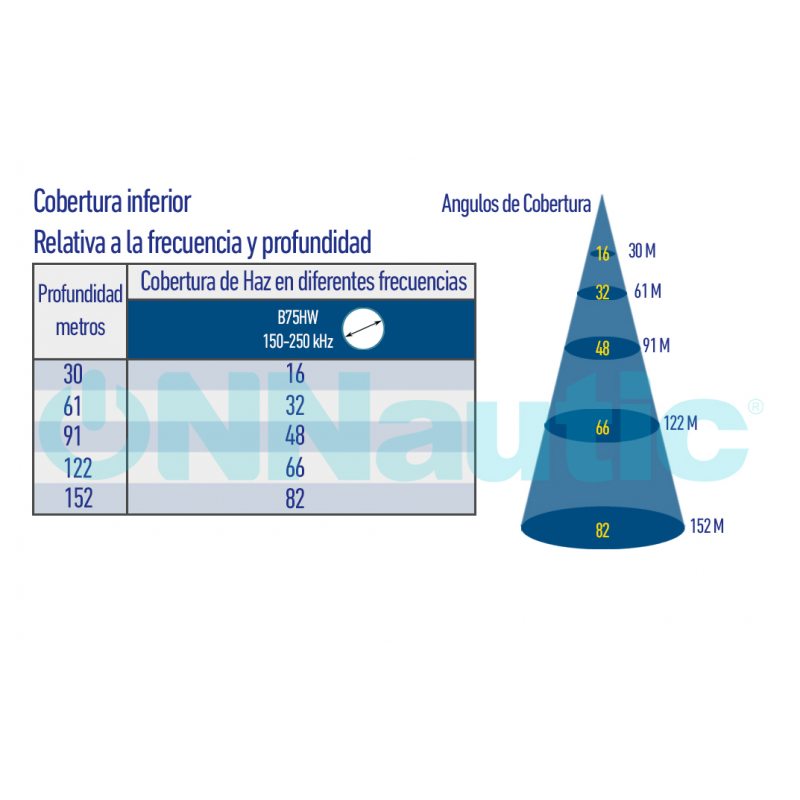 Gráfico de cobertura relativa a la frecuencia y profundidad del Transductor Pasacascos Airmar B75HW 0º xSonic (600w) Chirp. Esta tabla compara los elementos cerámicos Medios dentro del transductor, mostrando la diferencia en la cobertura del fondo debajo del barco. En frecuencia alta de 150kHz - 250kHz en ángulo de 30º con el rango máximo de profundidad será de 152 metros.