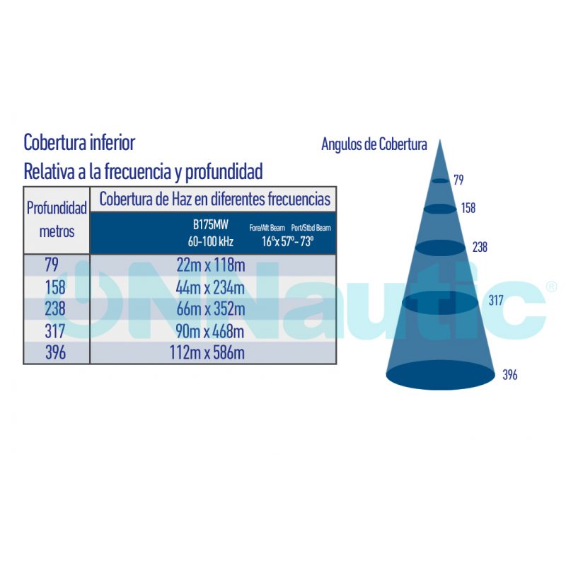 Gráfico de cobertura relativa a la frecuencia y profundidad del Transductor B175MW. Esta tabla compara los elementos cerámicos Medios dentro del transductor mostrando la diferencia en la cobertura del fondo debajo del barco. En frecuencia Media de 60-100 kHz en Angulo de 16º con el rango máximo de profundidad será de 400 metros.