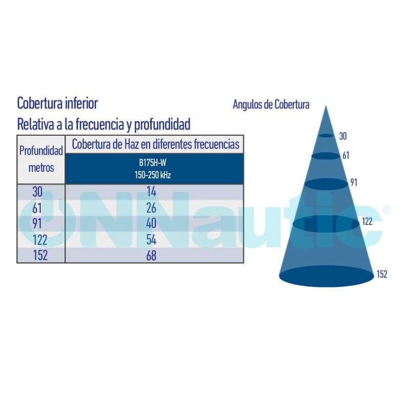 Gráfico de cobertura relativo a la frecuencia y profundidad del transductor B175HW. La tabla compara los elementos cerámicos de alta frecuencia y gran angular, mostrando las diferencias en la cobertura del fondo bajo la embarcación. En frecuencia alta de gran angular (150–250 kHz), con un ángulo de haz de 25º, se alcanza un rango máximo de profundidad de hasta 152 metros.
