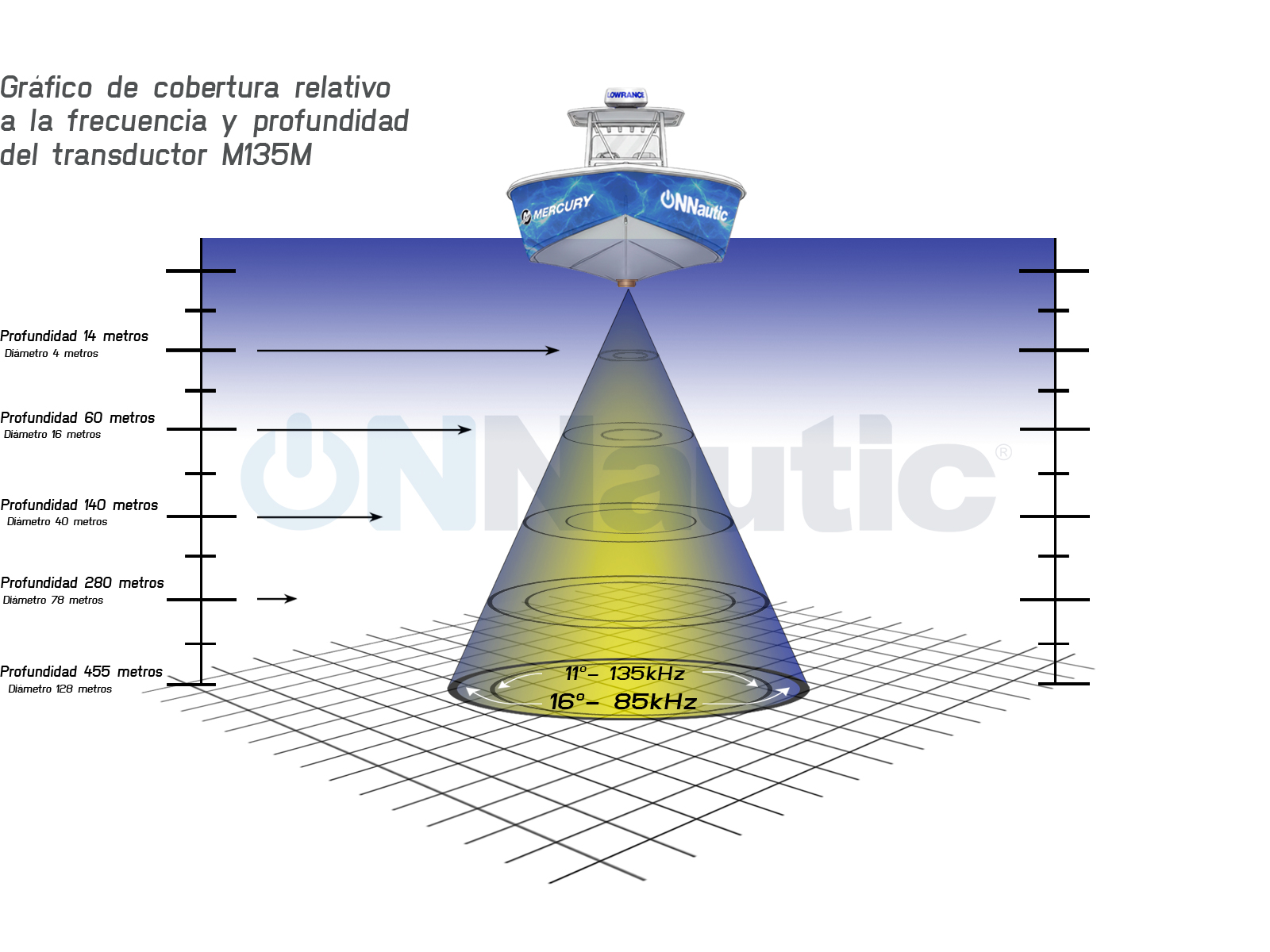 Gráfico de cobertura relativa a la frecuencia y profundidad del Transductor M135M 1kW. Esta tabla compara los elementos cerámicos de frecuencias Medias del Transductor M135M mostrando la diferencia en la cobertura del fondo debajo del barco. En frecuencia 85-135kHz, con un máximo de profundidad de 457 metros.